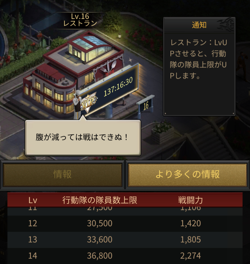 レストランのレベル上げで、隊列の総隊員数を増やせます。