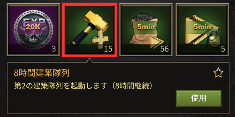 第2建築隊列は専用アイテムの使用で1回8時間使え、複数使うと時間が加算されます。