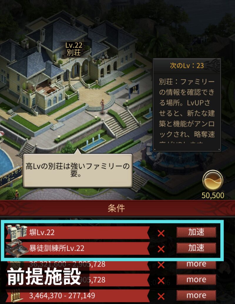 次の別荘レベル上げのために、前提施設を育てましょう。