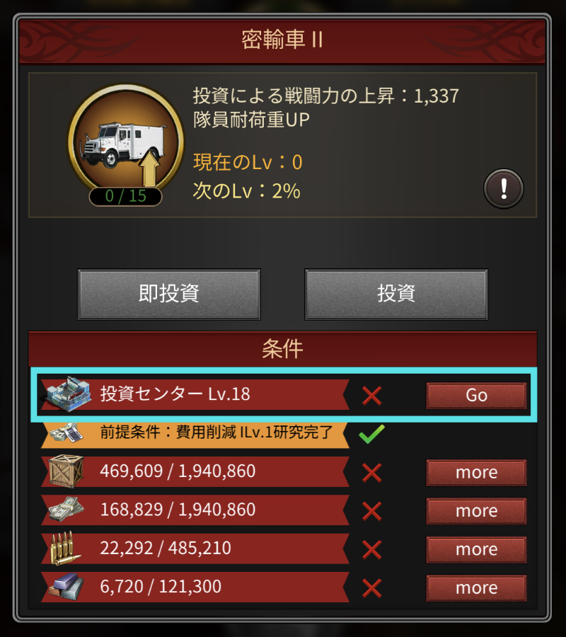 投資センターのレベルを上げると、解放できるバフが増えます。
